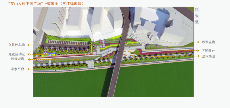 ①南門大橋下沉廣場,主要建設內容為跌級花海、下沉舞臺、沿河步道(全長約為2.1KM)、親水平臺步道(全長約為2.1KM)。