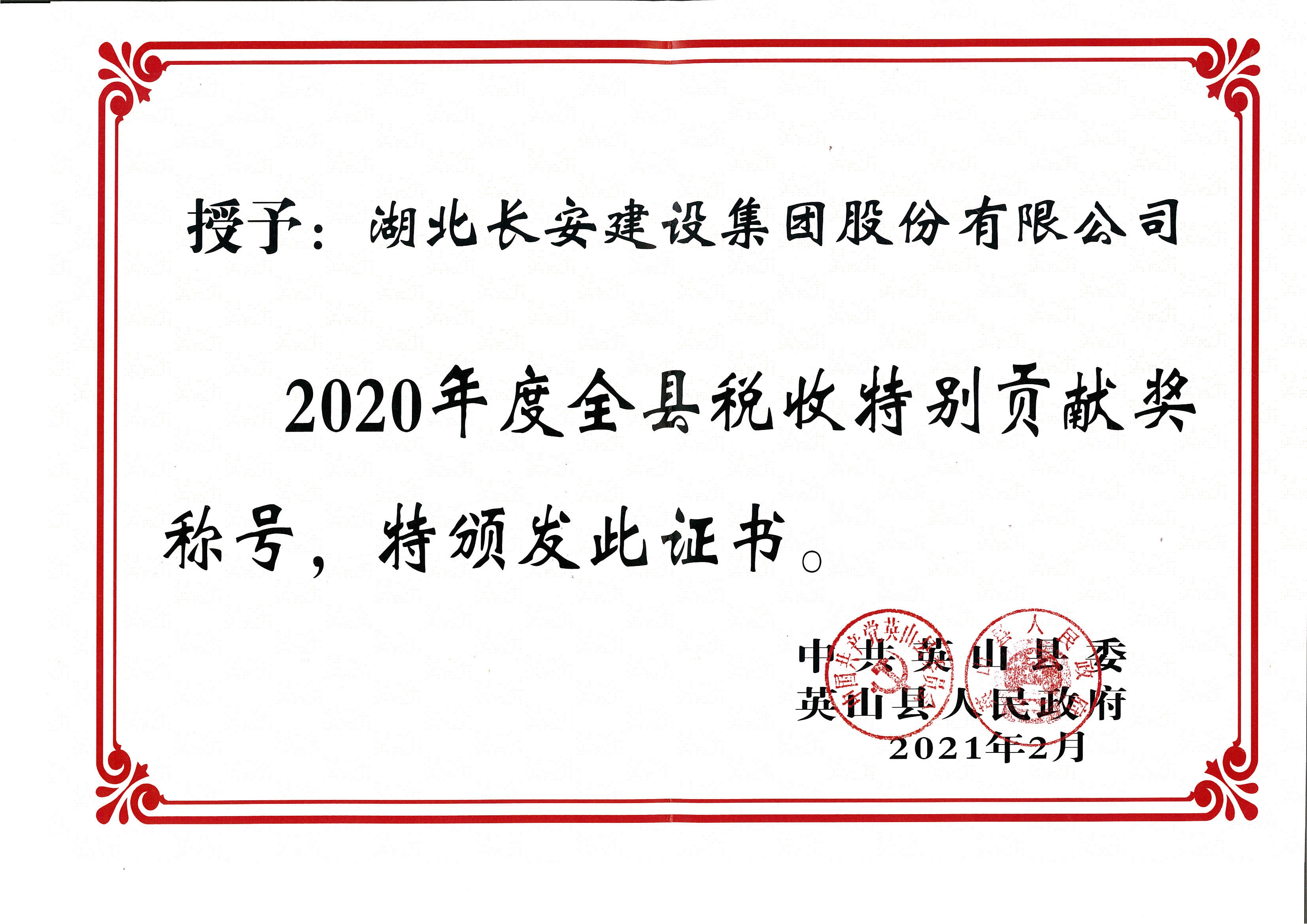 • 2020年度英山縣稅收特別貢獻獎