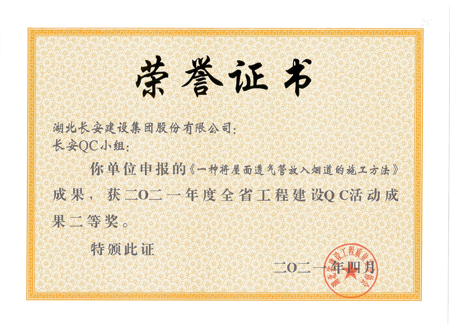 • 長安QC小組成果——《一種將屋面透氣管放入煙道的施工方法》榮獲2021年度省QC成果二等獎