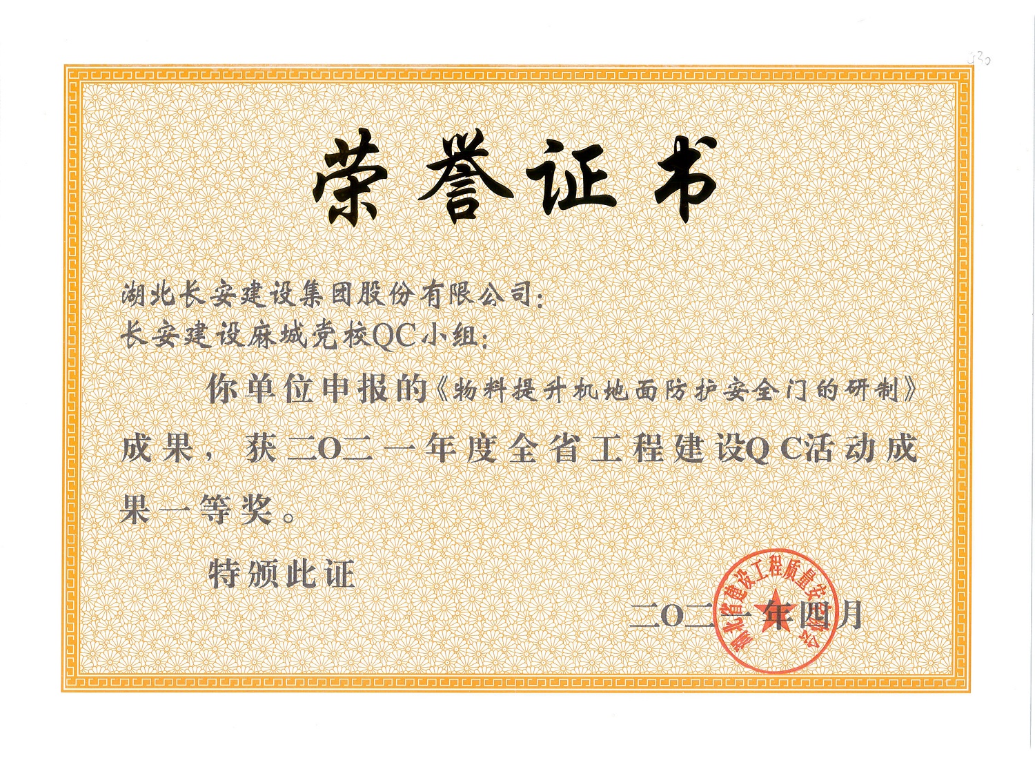 • 麻城黨校QC小組長安建設(shè)麻城黨校QC小組成果——《物料提升機地面防護安全門的研制》榮獲2021年度省QC活動成果一等獎