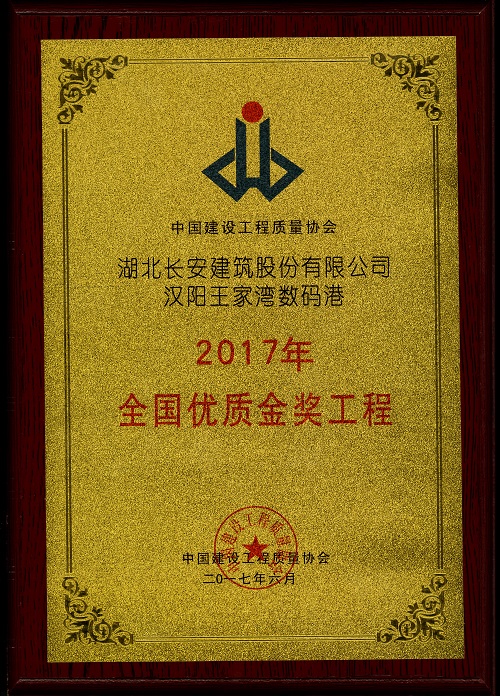 漢陽王家灣數碼港工程被評為“2017年全國優(yōu)質金獎工程”獎牌