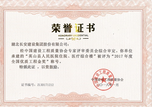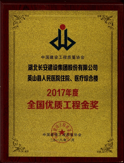 英山縣人民醫(yī)院住院、醫(yī)療綜合樓被評為2017年度全國優(yōu)質工程金獎