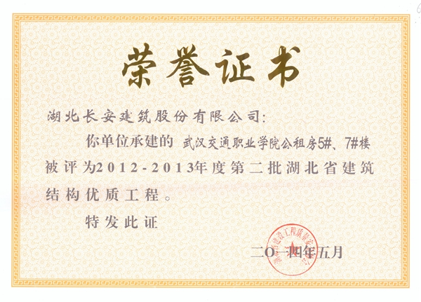 武漢交通職業學院公租房5、7#樓2012-2013年度省建筑結構優質工程