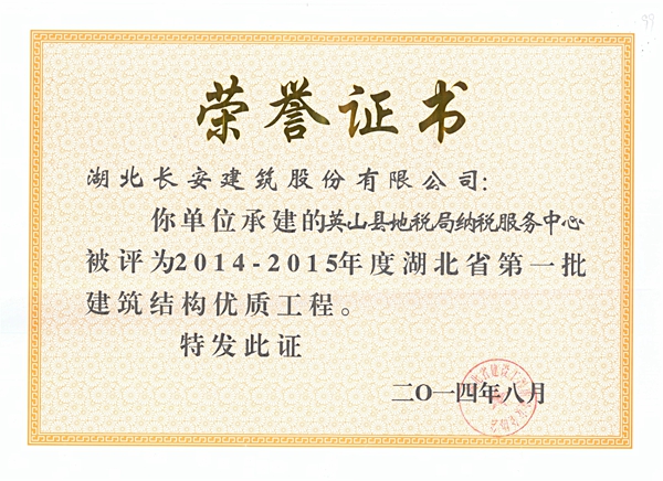 英山縣地稅局納稅服務中心被評為2014-2015年度省建筑結構優質