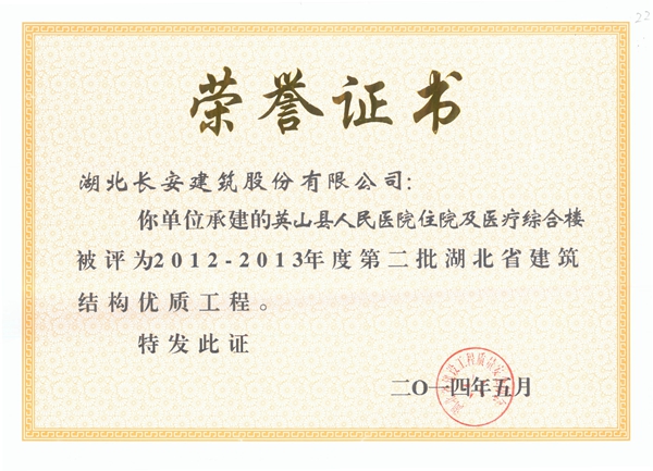 英山縣人民醫院住院及醫療綜合樓被評為2012-2013年度省建筑結構優質工程