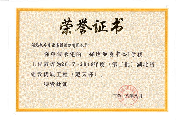 保障動員中心1號樓工程被評為2017-2018年度(第二批)湖北省建設(shè)優(yōu)質(zhì)工程(楚天杯)