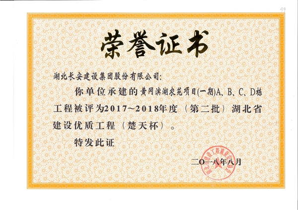 黃岡濱湖農(nóng)苑項目(一期)ABCD棟工程被評為2017-2018年度(第二批)湖北省建設(shè)優(yōu)質(zhì)工程(楚天杯)