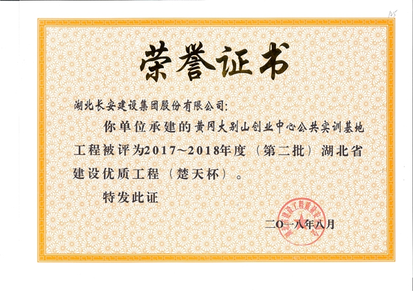 黃岡大別山創(chuàng)業(yè)中心公共實訓(xùn)基地工程被評為2017-2018年度(第二批)湖北省建設(shè)優(yōu)質(zhì)工程(楚天杯)