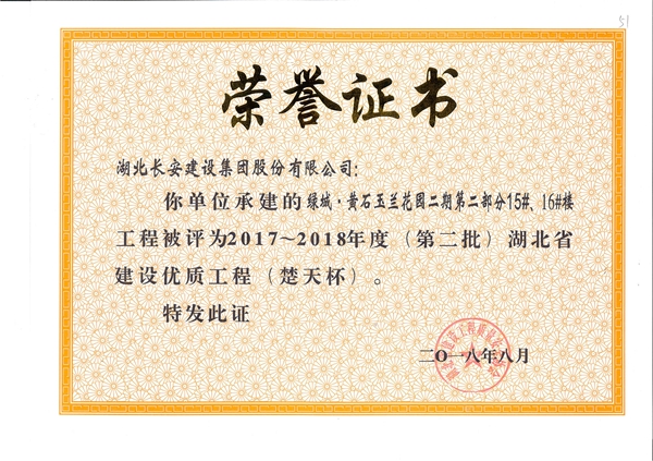 綠城黃石玉蘭花園二期第二部分(15#、16#)樓工程被評為2017-2018年度(第二批)湖北省建設(shè)優(yōu)質(zhì)工程(楚天杯)