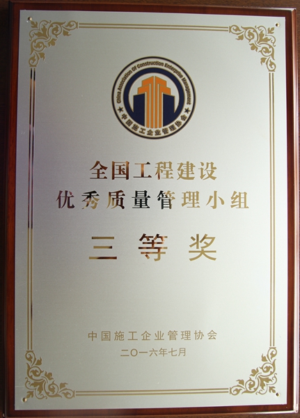 公司及QC小組榮獲2016年度全國工程建設優秀質量管理小組三等獎(內墻抹灰材料及施工工藝創新)獎牌
