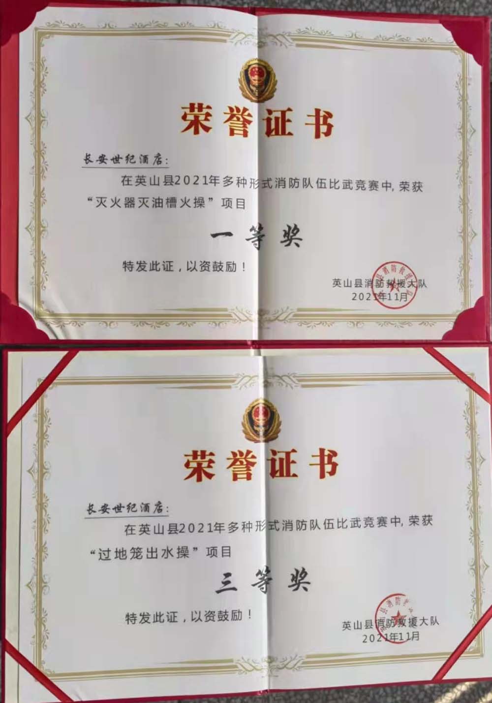 11月17日,英山縣消防救援大隊組織縣內106家大型企事業單位進行了以“落實消防責任 防范安全風險”為主題的11.9消防宣傳月啟動儀式暨多種形式消防隊伍比賽競賽活動,集團子公司--英山長安世紀酒店有限公司代表隊以訓練有素的過硬本領取得“滅火器滅油槽”項目一等獎、“過地龍出水操”項目三等獎和整體綜合實力第二名的好成績。
