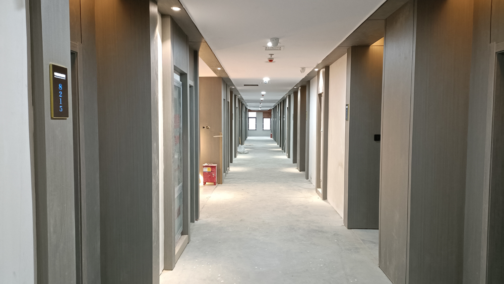 該隔離點搶建工程共計6層,總建筑面積6600m2,而且時間緊、任務重、裝修檔次較高。設計內墻涂料、木飾面板、墻布、軟包、壁畫、硬包、不銹鋼線條、木門、防火門、復合地板、人造石、淋浴房、開關、燈具、潔具、消防、電視、監控等,點多面廣,綜合管理難度較大。項目各班組采取晝夜連續施工的方式,加緊建設。長安建設集團積極整合資源,組織200余名精干職工從早晨6;00--晚上23:00不間斷施工,確保原約定2個月完成的施工任務在短短的10天內保質保量完成。