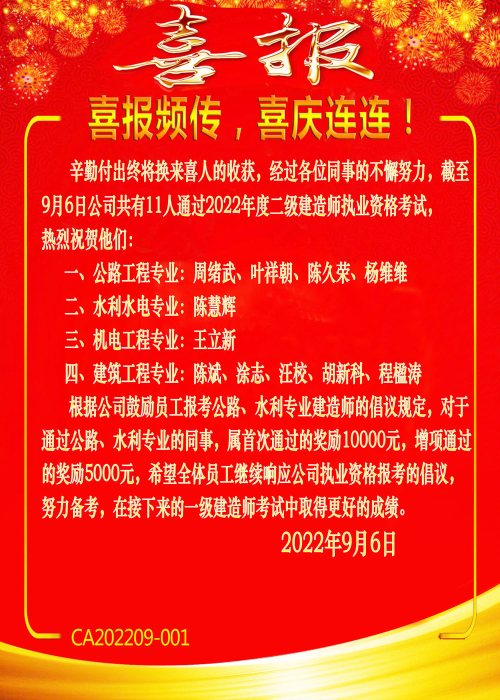日前,二級建造師執業資格考試名單公布,公司周緒武、葉祥朝等11人順利通過考試,獲得二級建造師執業資格證書。希望全體員工積極響應公司執業資質報考倡議,努力學習,積極備考,以實際行動和優異成績助力公司高質量穩健發展。