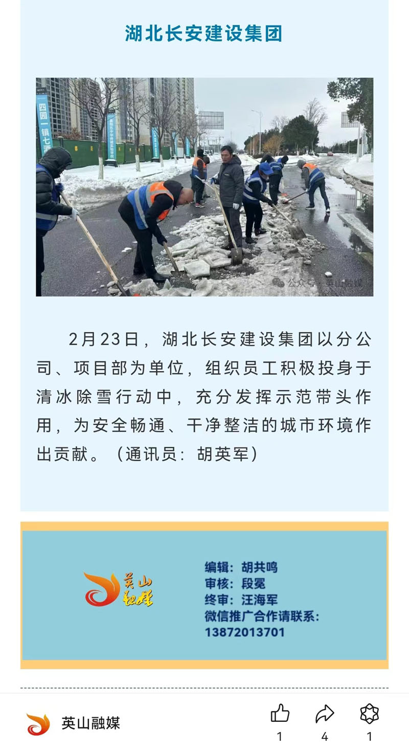 在英山,集團下屬市政分公司組織員工深入到各項目、城內各公園破冰除雪。在黃州,黃岡分公司、長冉公司員工積極到道路掃雪除冰。在襄陽,襄陽生態城項目部員工響應當地政府號召,打通高鐵交通運輸線,保春運,連續作戰為襄陽人民作貢獻。在麻城,麻城市公安局戰訓中心建設項目員工深入麻城道路,協助當地工作人員掃清道路積雪。在武漢、黃石等地,長安建設集團員工均自發參與抗擊冰雪行動中。