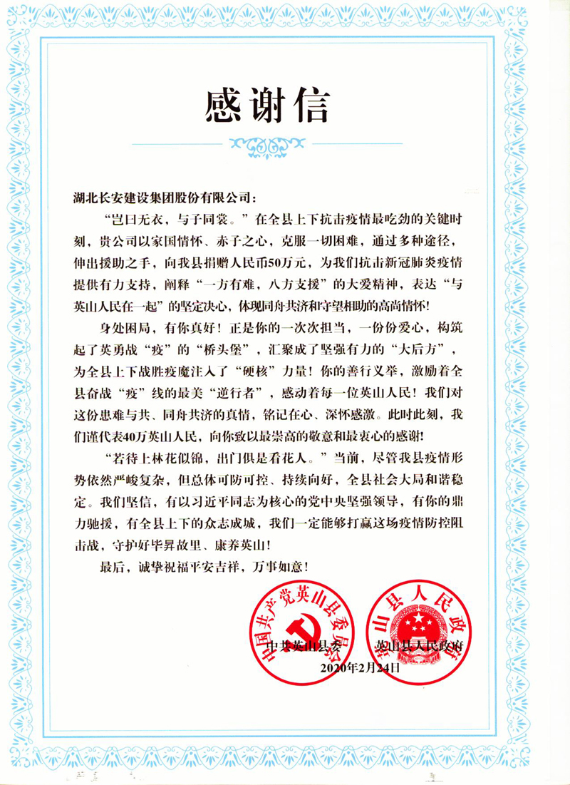 英山縣人民政府致集團的抗疫捐贈感謝信